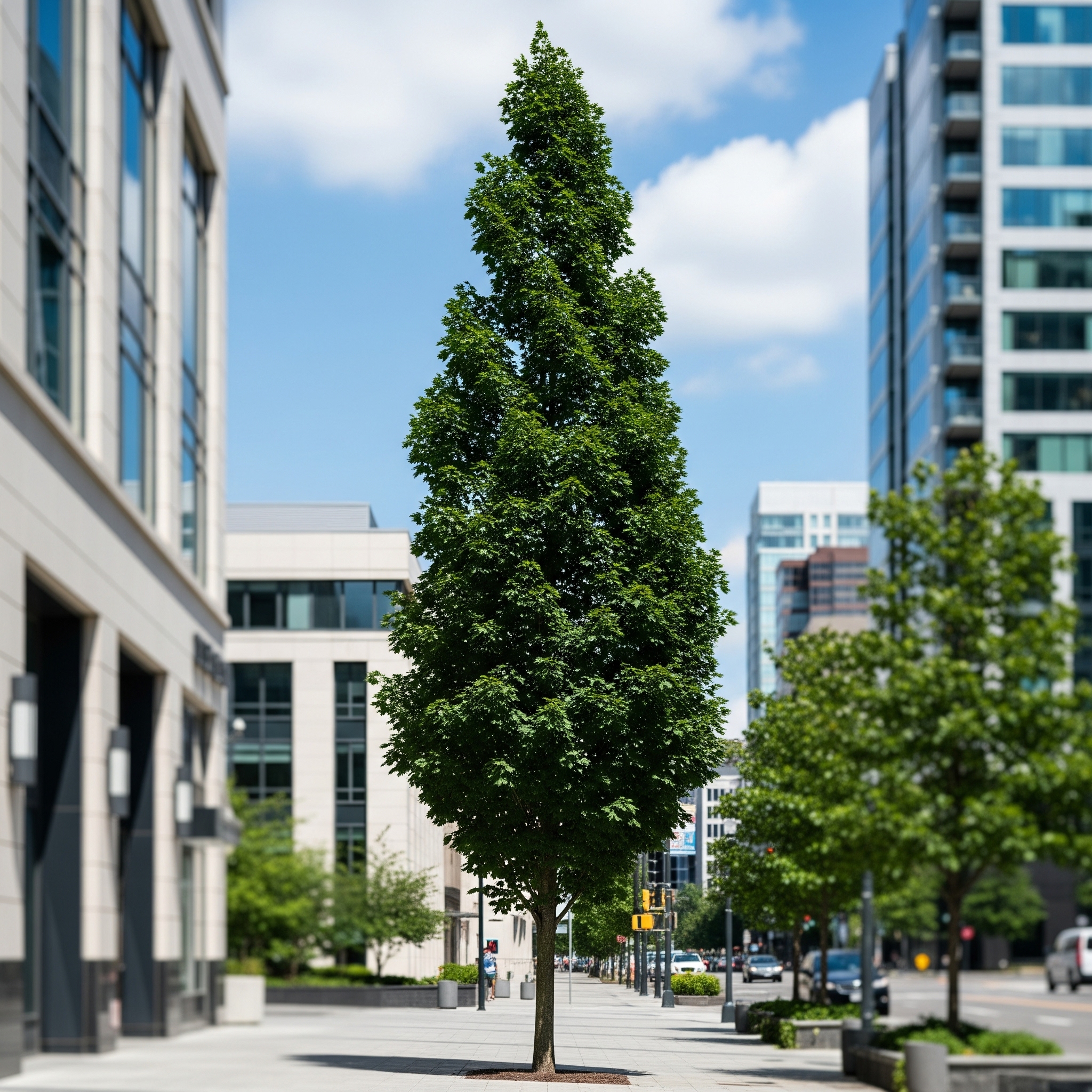 Columnar sugar maple (Acer saccharum – columnar form) is a variety of sugar maple distinguished by its narrow, upright habit, making it an excellent choice for restricted spaces or for creating rows. Its foliage is dense and an attractive dark green in summer, transforming into a magnificent range of fall colors from bright yellow to orange and scarlet red. It retains the general characteristics of the classic sugar maple, including its hardiness and longevity, but with a much more vertical form.