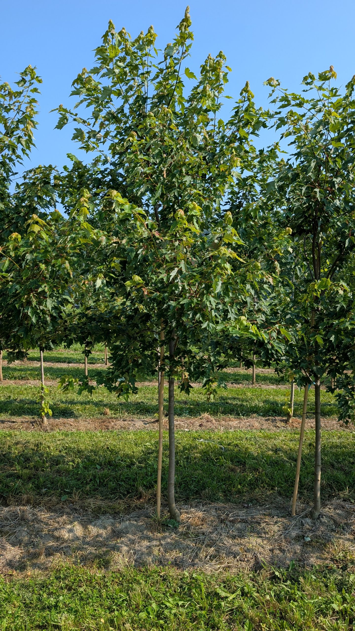 Tree Description: The ‘Sienna’ Maple is a medium to large-sized tree, known for its slender pyramidal shape and its dense, glossy foliage. It stands out especially for its spectacular fall colors, shifting from golden yellow to orange-red and burgundy. It is a hybrid cultivar resulting from a cross between the Red Maple (Acer rubrum) and the Silver Maple (Acer saccharinum), giving it strong adaptability and fast growth.
